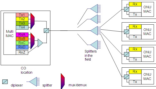 第一種方案是具有後向兼容能力的(de)TDMA PON堆疊方案,這(zhè)種方案發展的(de)初衷是解決“NG-PON2網絡如何兼容目前已經廣泛部署的(de)PON及可(kě)能部署的(de)10G PON網絡”;