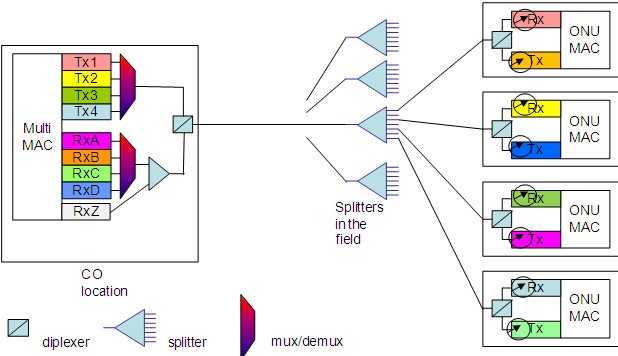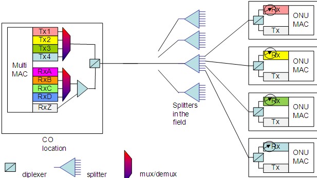 在此階段,ONU擁有固定的(de)下(xià)行接收機和(hé)傳統發射機。目前這(zhè)一步可(kě)以馬上實現,因爲不需要任何其他(tā)未經驗證的(de)技術。但是需要爲未來(lái)的(de)的(de)堆疊系統開放頻(pín)譜資源,同時(shí)OLT也(yě)需要擁有必要的(de)波長(cháng)陣列來(lái)面向未來(lái)的(de)堆疊系統。