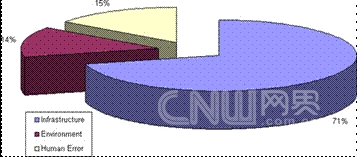 來(lái)自第三方機構(Sun Microsystems/Gartner)的(de)關于引起網絡宕機的(de)原因的(de)統計數據,如上圖1-1所示。其結論是:引起網絡宕機的(de)根本原因中,72%的(de)部分(fēn)與基礎設施相關,這(zhè)72%中,硬件設備原因占10%,軟件原因占18%,剩下(xià)的(de)71%的(de)原因是網絡布線所引起。
