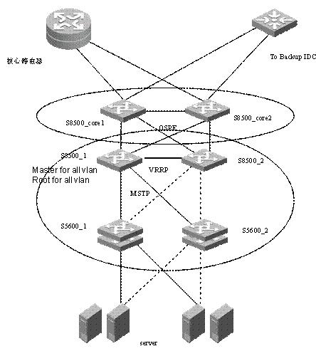 産品能力:骨幹區(qū)采用(yòng)大(dà)容量萬兆交換機,滿足日益增長(cháng)的(de)數據中心帶寬需求。彙聚層采用(yòng)雙機互備的(de)8500交換機,通(tōng)過VRRP機制保證系統的(de)高(gāo)可(kě)靠性。接入大(dà)量使用(yòng)5600高(gāo)密度端口可(kě)堆疊千兆交換機,滿足服務器接入的(de)高(gāo)帶寬要求和(hé)高(gāo)可(kě)靠性、可(kě)擴充性需求。