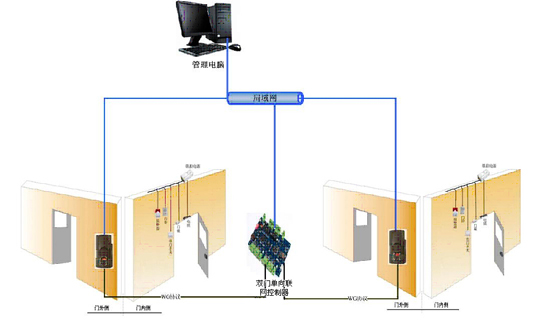 該方案是采用(yòng)專業的(de)雙門雙向門禁控制器和(hé)指紋讀頭來(lái)實現雙門單向指紋門禁管理(lǐ)。門外安裝MF-850或MF-10,通(tōng)過WG協議(yì)與雙門雙向的(de)門禁控制器SI-Dm612或SI-Dm652連接,門内安裝開門按鈕。
